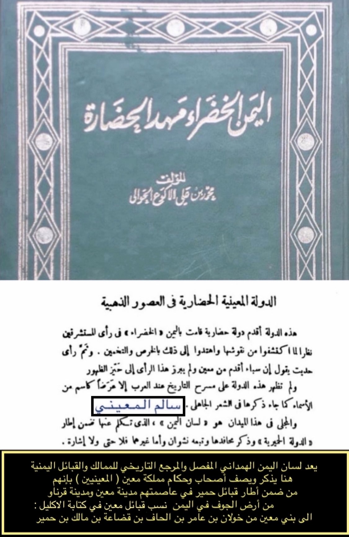 Uzivatel سالم المعيني Na Twitteru تكلم هنا عن الدولةالمعينيةفي العصور الذهبيةوذكرأن المجلى في تاريخهاوهذا الميدان هو لسان اليمن الهمداني الذي تكلم عن مملكة معين ضمن أطار قبائل حمير ولوكانت من القبائل الكهلانيةالهمدانيةأو المذحجيةلسرةذالك