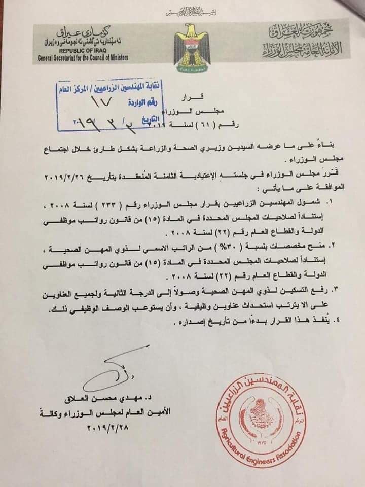 بالوثيقة قرار مجلس الوزراء بشأن زيادة مخصصات ذوي المهن الصحية والمهندسين الزراعيين وكالة الاولى نيوز