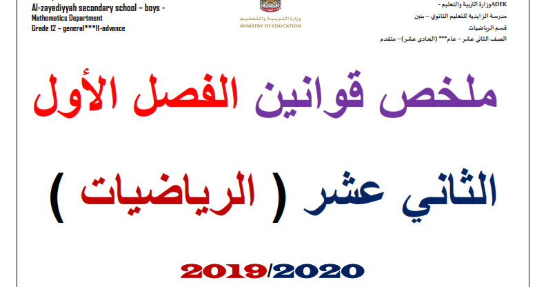ملخص قوانين مادة الرياضيات للصف الثاني عشر الفصل الدراسي الاول 2019 2020